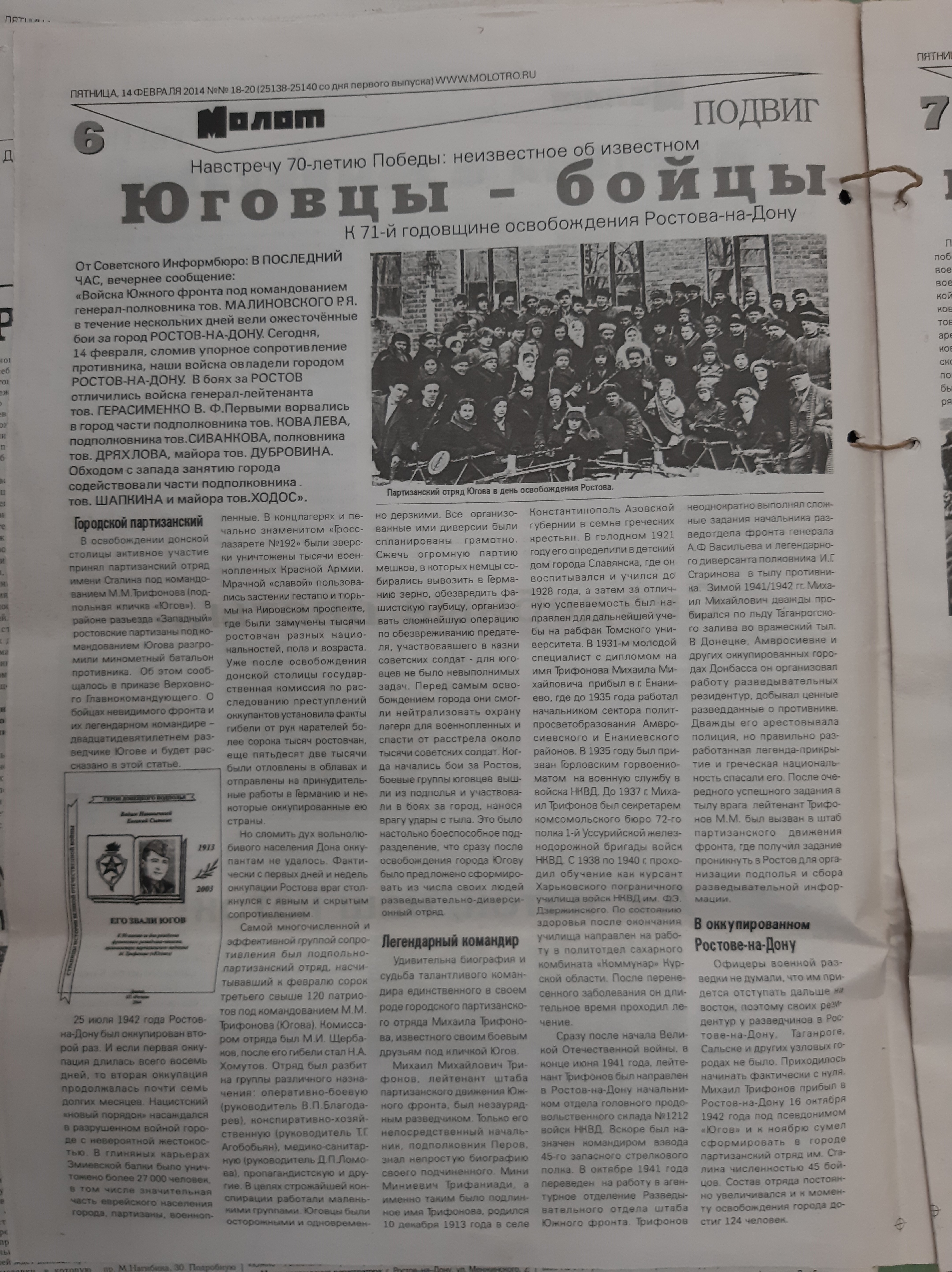 Одной из самых активных групп партизан в Ростове-на-Дону был отряд, которым командовал Михаил Трифонов-Югов (На доме № 110 по улице Металлургической укреплена мемориальная доска, свидетельствующая о том, что в 1942 - 1943 гг. здесь находился штаб этого партизанского отряда). Также одна из квартир отряда располагалась на первом поселке Орджоникидзе.